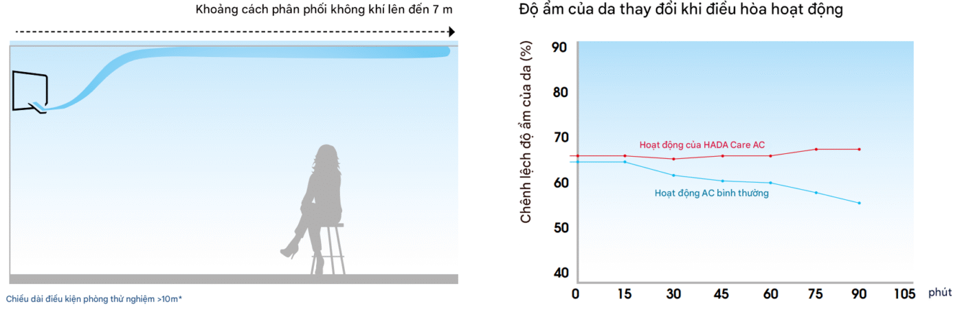 Khác với chế độ làm lạnh thông thường thường tạo luồng gió thổi trực tiếp dễ gây khô da, HADA Care Flow điều chỉnh cánh đảo gió hướng luồng khí lạnh đi xa và phân bổ đều trong phòng. Không khí được làm mát một cách đồng đều, không gây lạnh buốt khó chịu và vẫn duy trì cảm giác dễ chịu cho người dùng.