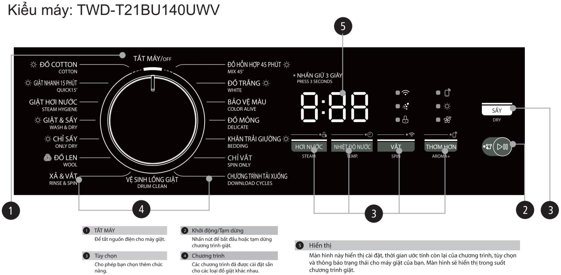 Đồ cotton, Giặt nhanh 15 phút, Giặt hơi nước, Giặt & sấy, Chỉ sấy, Đồ len, Xả và vắt, Đồ hỗn hợp 45 phút, Đồ trắng, Bảo vệ màu, Đồ mỏng, Khăn trải giường, Chỉ vắt, Chương trình tải xuống, Vệ sinh lồng giặt